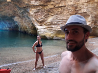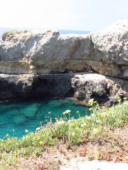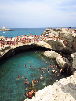 * Nous sommes allé voir la "Grotta della poesia". Cette magnifique piscine naturelle est un lieu très prisé des Italiens. La légende raconte qu'une princesse aimait se baigner ici et que de nombreux poètes ont été inspiré. Vu l'effervescence à cette époque de l'année, nous ne nous y sommes pas baigné, mais nous avons pu profiter de ce bijou de la nature. La côte aux alentours est juste magnifique. Nous avons poursuivi jusqu'à "la baie de Truchi", réputée pour être une des plus belles plages des pouilles et donc ultra touristique. Nous avons été agréablement surpris car effectivement c'est un décor paradisiaque, mais il n'y avait pas trop de monde! On a pu profiter pleinement de cet endroit idyllique avant qu'un orage ne vienne pointer le bout de son nez.